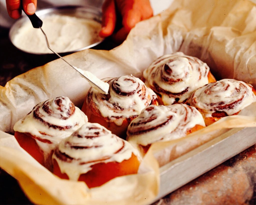 Для теста понадобится: Муку смешиваем с дрожжами и сахаром и даём постоять 10 минут. ( в это время дрожжи начинают взаимодействовать с мукой) Добавляем соль, яйца, растопленное масло, тёплое молоко. Замешиваем тесто не больше 10 минут, если тесто липнет к рукам - присыпайте мукой. Чистую ёмкость смазываем маслом и оставляем в ней тесто подниматься на 1-1,5 часа. Для начинки понадобится: Раскатываем тесто в прямоугольник (чем тоньше раскатаете - тем больше будет слоев). Смазываем тесто сливочным маслом посыпаем смесью сахара с корицей (оставьте один край нетронутым). Скатываем рулет, смазываем водой нетронутый край и докручиваем рулет. Нарезаем булочки 3,5-4 см (толстые могут не пропечься!), форму для запекания смазываем сливочным маслом. Выкладываем булочки в форму, накрываем полотенцем и даём отдохнуть ещё 40 минут. Спустя 40 минут отправляем булочки в духовку на 25 мин при 180 гр. Для крема понадобится: Смешиваем с помощью миксера. Достаём булочки из духовки и сразу же смазываем к