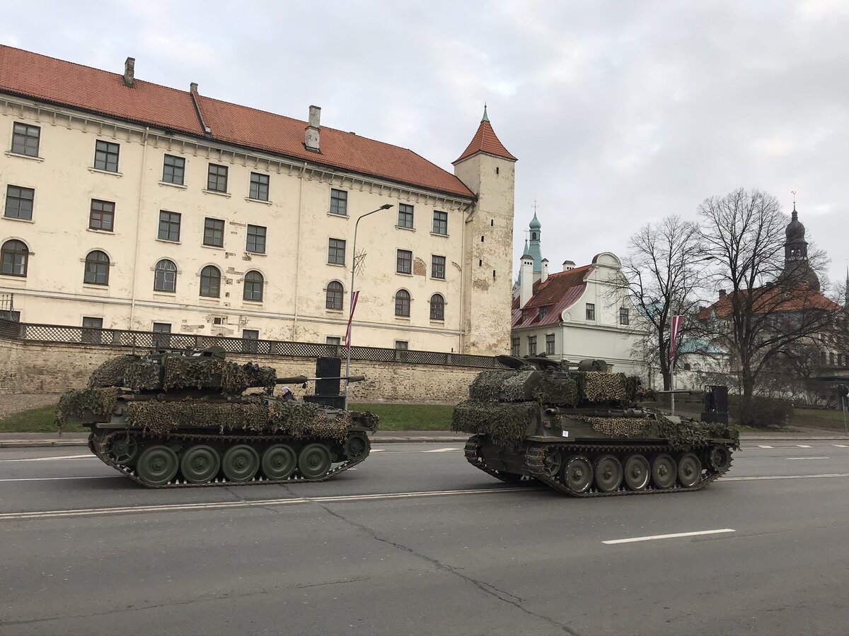 На улицах города появились различные танки и прочая военная техника. А на берегах Даугава (Западной Двины) в порту Риги пришвартовались военные корабли. Танки и прочие самоходные машины привезли накануне Дня независимости на фурах и выгрузили на набережной в старом городе, прямо у стен Рижского замка. Ну, естественно, масса народа собралась на такое зрелище, и в толпе звучала в основном русская речь. Латвия с 2004 года в НАТО и за это время ее вооруженные силы изрядно пополнились. Если вы думаете, что это новейшие образцы техники стран НАТО, то глубоко ошибаетесь. Все это техника б/у. Более 100 подержанных бронетранспортеров Латвия купила у Великобритании. Около 50 самоходных арт-установок были куплены у США. Старые джипы - у тех же США, Великобритании и Германии. Такая вот она, армия Латвии - с техникой б/у, но гордая.
