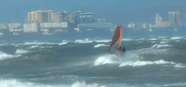 В Интернете появился видеоролик из Новороссийска. Отчаянный виндесерфер, с помощью друзей, зафиксировал факт экстремального катания на волнах. На море ураганный шторм, скорость ветра до 35 м/с. По словам спортсмена, он давно хотел испытать себя под парусом в руках при таком ветре. Ведь Бора в Новороссийске дует ежегодно не менее 50 дней в году. Друзья помогли спортсмену донести оборудование с серфстанции к воде. Сам рисковать не стал, ветер просто мог вырвать с рук оборудование и разбить о камни. В воде, несмотря на волны, оказалось проще. Правда, у берега на Косе еще и течение, которое тянет в сторону старого причала. В общем, настоящего удовольствия от катания под парусом по волнам, виндсерфер не получил. Зато смог победить стихию. Волны были коварные - быстрые с минимальным периодом. О красивых поворотах он даже не думал. Прыжки совершал лишь в перерывах между порывами ветра. По данным портала Azur.ru, 21 ноября на Новороссийск обрушился норд-ост (Бора). Ветер обесточил несколько р