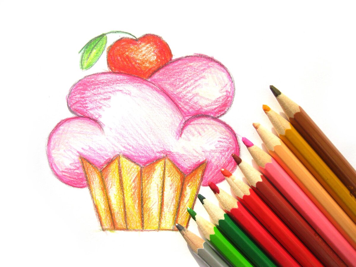 Этот урок посвящается тем, кто любит разные сладости от конфет до тортиков и домашней выпечки. Он будет таить у вас во рту во время окончательного этапа, ведь рисунок очень красивый и естественный, что так и хочется откусить кусочек от него! Необходимые материалы: Этапы рисования: 1. Рисуем кекс с основания бумажной формочки. Для этого следует нарисовать одну горизонтальную линию. К ней пририсовываем две боковые вертикальные и одну по центру. 2. Добавим по бокам центральной вертикальной линии еще по две с каждой стороны разной длины.