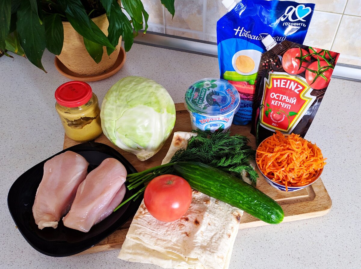 Сегодня готовим вкусную, сытную и всеми обожаемую шаурму моего любимого размера. Делать мы её будем из куриной грудки, благодаря чему она будет питательной и диетической одновременно, а большое количество свежих овощей сделает это блюдо ещё и полезным. Для приготовления двух больших шавух понадобится: Лаваш тонкий - 2 шт. Филе цыплёнка (грудка) - 2 шт. Капуста белокочанная - 200 гр. Морковь корейская - 100 гр. Огурец свежий - 1 шт. Помидор свежий - 1 шт. Укроп - 1 пучок. Для соуса: Сметана - 80 гр. Майонез - 80 гр. Кетчуп - 80 гр. Горчица - 10 гр. Соль, перец - по вкусу Начнём: Куриную грудку обжариваем с двух сторон в небольшом количестве растительного масла. Сначала делаем это на сильном огне до образования золотистой корочки, Потом убавляем огонь до среднего и доводим до готовности (готовится грудка очень быстро, поэтому смотрите не пересушите) Теперь овощи. Огурец и помидор режем соломкой. Капусту рубим так же соломкой добавляем соль и разминаем руками для придания мягко