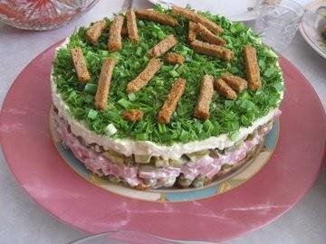 - Выкладываем сухарики в майонезе (первый слой)