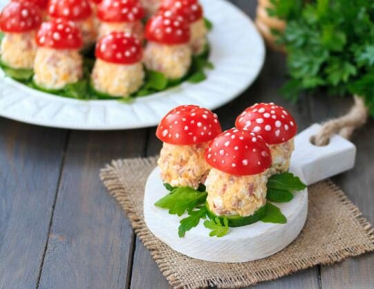 Чарующая, аппетитная, яркая и очень нежная на вкус закуска "Грибочки" всего за 25 минут решит ваши проблемы с тем, что же приготовить на новый год. Ингредиенты, как всегда, очень просты: Начинаем готовить: Перед готовкой не забудьте поставить варить яйца, так вы сэкономите время) 1. Натираем сыр и яйца на мелкой тёрке, режем ветчину небольшими кубиками. Высыпаем всё в миску, добавляем 2-3 столовых ложки майонеза и немножко перчим. Должна получится густая масса, которая будет легко сохранять форму. 2. Займёмся телом наших грибочков. Делим получившуюся смесь на 20-30 небольших порций и скатываем из них шарики. Советую вам намочить руки - лепить будет легче) 3. Моем огурцы и помидоры. Помидорки разрезаем пополам, а огурцы режем небольшими кружочками. На сервировочную тарелку высыпаем немного зелени, а поверх выкладываем порезанные огурцы. 4. Теперь берём наши шарики и лепим из них небольшие конусы так, чтобы они напоминали грибные ножки. Выкладываем на огурцы, а сверху накладываем полов