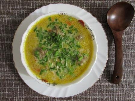 Ингредиенты: морковка - 1шт, лук репчатый - 1шт, картофель - 4шт, фарш - 150г, сыр творожный - 2-3 ст.л., соль, кари. Приготовление: Морковку и лук мелко накрошить и обжарить на сковороде. Из фарша сделать шарики , залить водой. Пусть варится 5 мин. Картофель нарезать и отправить в сковородку, варить 15 мин. Добавить сыр и поварить еще 5 мин. Добавить зелени.