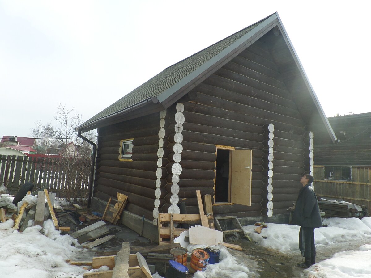 Баня, в которой заранее предусмотрели и заложили дымовую трубу, когда строили крышу.