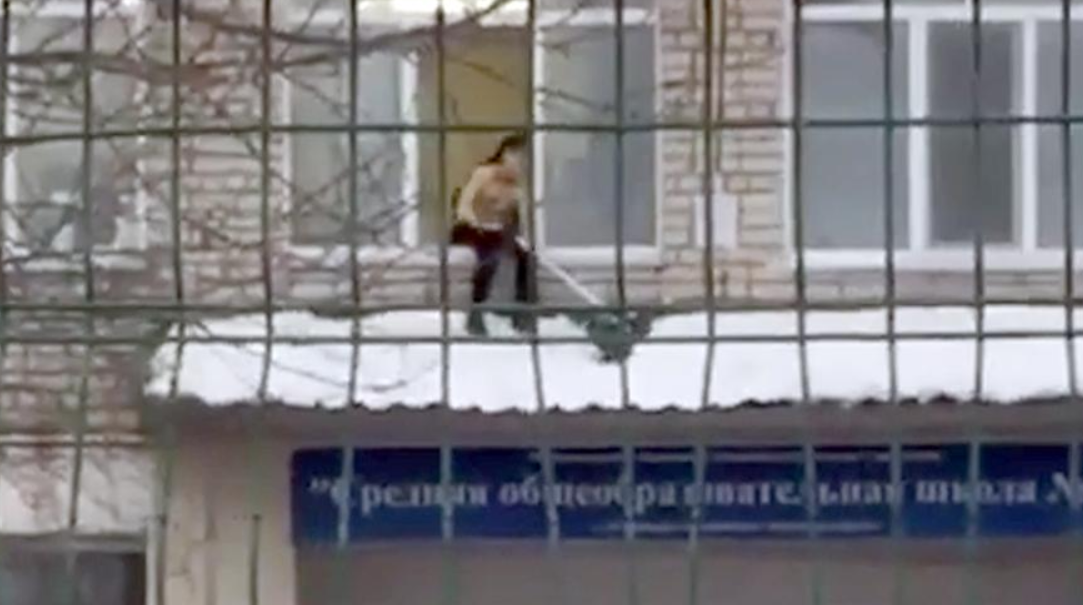 Голый школьник чистит снег на крыше — его за пояс придерживает учитель. Сошло бы с рук легко, если б не попало в сеть