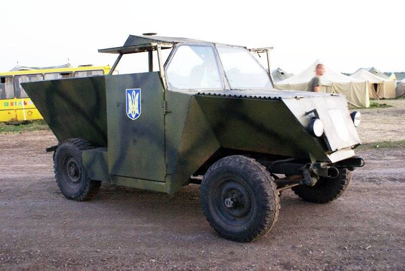Когда на Украине начались боевые действия, то стало понятно, что бронетехника в стране находится просто в отвратительном состоянии. Сюда добавились огромные потери боевых единиц, которые, по официальным данным на 2014 год, составили около 70% от все бронетехники страны. Ситуацию пришлось как-то исправлять уже на местах, создавая бронеавтомобили из всего, что было под рукой. Такие машины получили общее название "Шушпанцеры". Сегодня я покажу вам лишь малую часть из них. Давайте начнём с этого малыша, в котором лишь профессионалы узнают УАЗ-469Б. Проект "бронетюнинга" нашего УАЗика получил название "Скорпион". Обратите внимание на совершенно новый кузов с V-образнымднищем. Видимо, это некоторые зачатки защиты от подрыва на мине, а может просто кто-то решил сэкономить металл. Лобовое стекло сделано из двух боковых бронестекол от какого-то другого автомобиля. Боковые двери представляют собой глухие створки с откидывающимися вверх небольшими бойницами. Батальон МВД Украины «Днепр-1» какое-