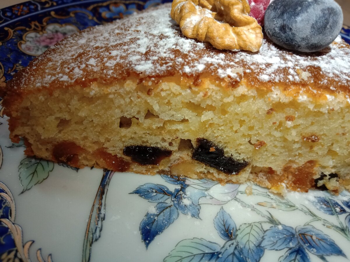 Люблю готовить пироги, а этот рецепт самый любимый. На вкус как конфета, просто тает во рту. Готовить его одно удовольствие, без хлопот. Особенно приятно, когда близкие одобряют и просят приготовить ещё. Делюсь рецептом вкусного пирога: Понадобится взбить венчиком три яйца в пену. Добавить один стакан сахара без горки и ещё раз взбить. Чем пышнее будут взбиты яйца с сахаром, тем выше получится пирог. В тесто добавляем один стакан сметаны и хорошо перемешиваем до однородности. Один стакан просеянной муки соединить с чайной ложкой разрыхлителя. Аккуратно добавить в тесто и круговыми движениями лопаткой смешать все ингредиенты - должно получается как густая сметана. В качестве начинки я использую: 50 грамм изюма, столько же кураги чернослива и грецких орехов. Можно положить любые сухофрукты и орехи. Все фрукты и орехи нарезаю не сильно мелко, чтобы на зубок попадалось. Смешиваю все составляющие. Форму для выпекания смазать сливочным маслом и распределить по ней равномерно тесто с начи