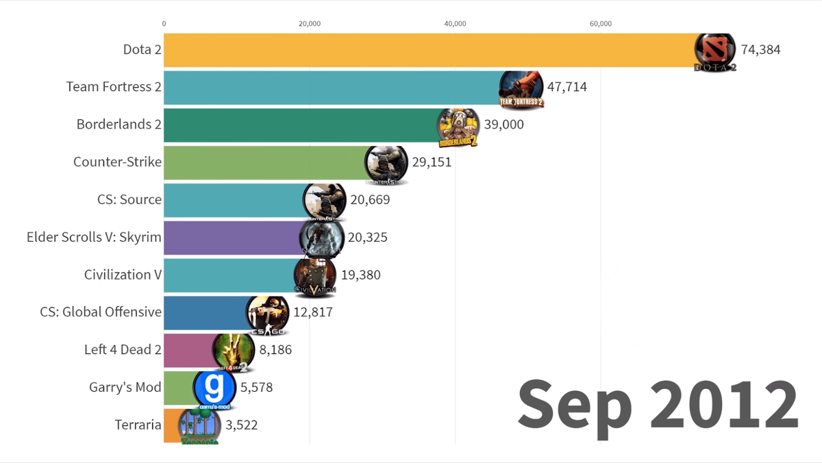Steam - крупнейший онлайн-сервис, хранящий очень много интересной и полезной информации. Какие игры были популярны пять лет назад? Мог ли кто-то противостоять Dota в 2013 году? Растерял ли PlayerUnknown's Battlegrounds свою аудиторию?! Для того, чтобы ответить на эти вопросы, за основу будет взята статистика с 2013 по 2019 год, и дабы сократить объем информации, предлагаю сравнивать только лишь один месяц - сентябрь! 🔹 🔹 🔹 🔹 🔹 🔹 🔹 🔹 🔹 🔹 🔹 🔹 2012 год 2013 год 2014 год 2015 год 2016 год 2017 год 2018 год 2019 год 🔹 🔹 🔹 🔹 🔹 🔹 🔹 🔹 🔹 🔹 🔹 🔹 Восемь фактов, восемь таблиц, восемь лет исследований, надеюсь, Вам было интересно! 🔹 🔹 🔹 🔹 🔹 🔹 🔹 🔹 🔹 🔹 🔹 🔹 Всем спасибо, подписывайтесь на канал, чтобы не пропустить новые статьи, новую инфографику. Ставьте лайки и, конечно же, прокомментируйте. Напишите, чем Вам запомнились эти годы, связывают ли Вас хорошие воспоминания с этими играми? Сколько игр у Вас в библиотеке Steam из первой
