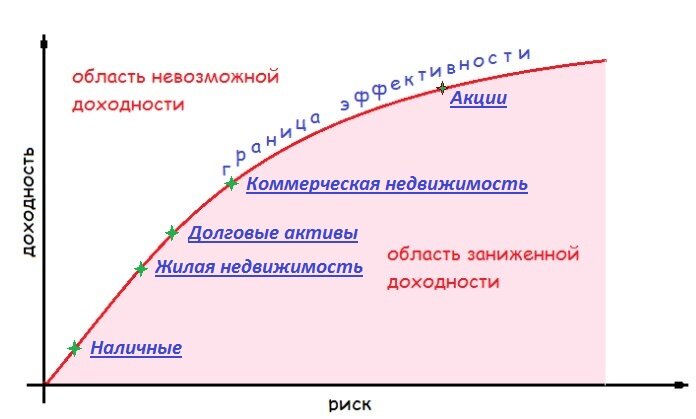 Ну и с акциями. Тут вообще, на самом деле на графике они не в какой-то конкретной точке должны быть, а как бы размазаны по оставшейся части графика. Дело в том, что бизнесы компаний, выпускающих акции, могут быть совершенно разными - от проверенных временем, типа Сбербанка или Кока-Колы, до совершенно новых, так называемых венчурных компаний или стартапов, которые только что появились, и вложения в них являются довольно рискованными.