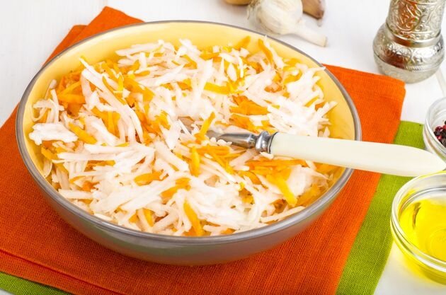 Дачный сезон уходящего года многие называют «корнеплодным»: удались свекла и морковь, репа и брюква. Ингредиенты: по 1 корнеплоду дайкона и моркови, 1 крупное яблоко, нежирная сметана – для заправки салата. Приготовление: 1. Корнеплоды вымыть и очистить, измельчить на крупной терке или соломкой (на терке для корейских салатов). 2.Яблоко нашинковать тонкой соломкой. 3. Ингредиенты заправить сметаной и аккуратно перемешать. Светлана Сенаторова. Читайте также: Рагу «Рыжик» Овощи, фрукты и ягоды, вредящие лечению