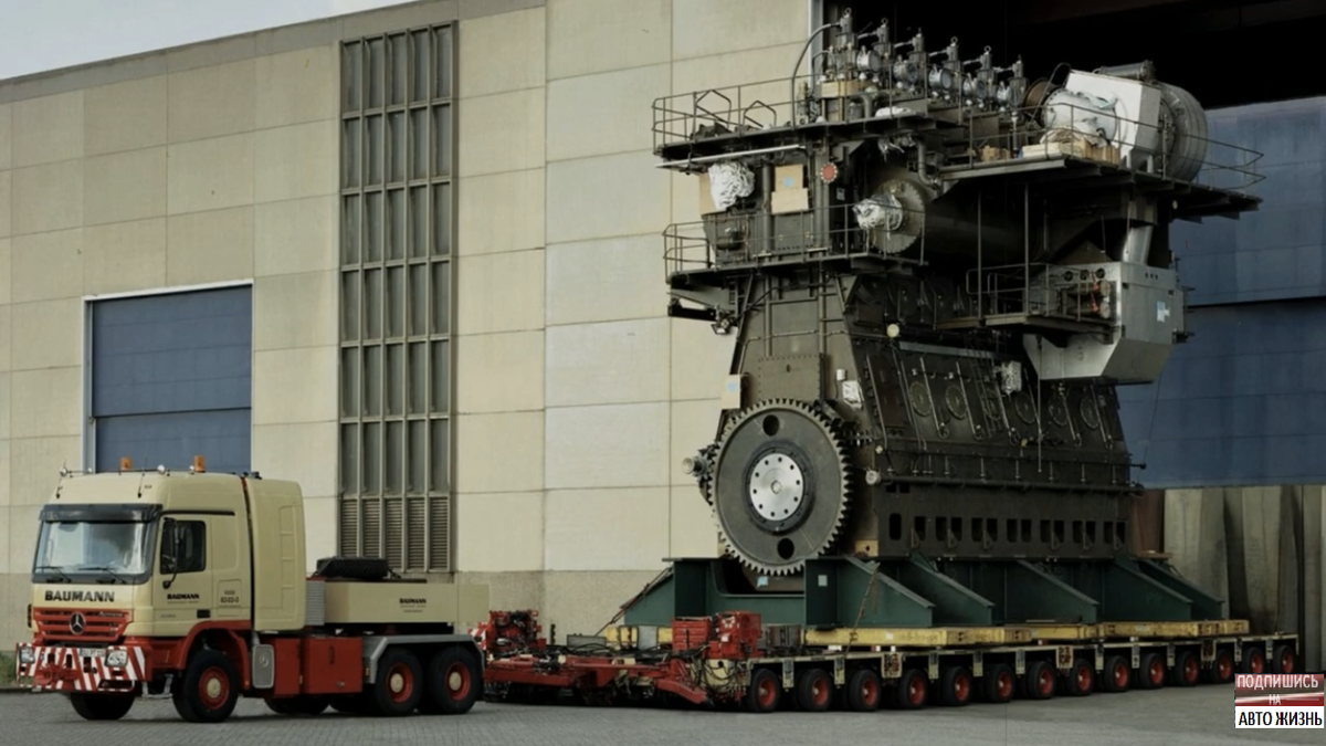 Всем привет. Самый огромны и самый мощный двигатель, работающий на дизельном топливе, фирмы Wartsila (финская машиностроительная компания). Мотор имеет цилиндров, которые выдают 108920 л.с. или 80000 кВт (способен обеспечит энергией посёлок среднего размера). Внимание! Крутящий момент составляет более 7600000 Н*м. Это просто немыслимо. Масса двигателя составляет 2300 тонн, высота 13,5 метров, длина 27 метров. Мотор с четырёхэтажное здание. Рабочий объём каждого цилиндра составляет 1820 литров, а всего двигателя 25480 литров. Огромные цифры, но двигатель очень эффективный и один из самых экологически чистых в своём классе. Дополнительно мотор оснащён системой утилизации остаточного тепла выхлопных газов – турбогенератор производящий электрическую энергию до 9860 кВт. Но зачем нужен такой двигатель? Где он может применяться c такой мощностью? В 2006 году этот двигатель был установлен на грузовой корабль Emma Maersk, который способен перевозить 11 тысяч 20-фунтовых морских контейнеров со