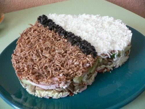 Салат "Любимый" Ингредиенты: - Копченая куриная грудка – 350 гр - свежие шампиньоны – 300 гр - чернослив – 200 гр - куриные яйца – 6 шт - головка репчатого лука - свежий огурец - маслины – несколько штук - майонез Способ приготовления: Салат “Любимый” очень напоминает по внешнему виду торт. Несомненно, такая еда всегда украсит праздничный стол. Рекомендую взять на заметку кулинарный рецепт праздничного салата, для приготовления которого необходима форма любого вида. В нее складываем слоями компоненты салата, промазывая майонезом. Первый слой – нарезанная соломкой копченая куриная грудка. Второй слой – протертые желтки 6 яиц. Третий слой – нарезанный соломкой чернослив (предварительно замоченный на несколько часов в кипятке). Четвертый слой – шампиньоны, обжаренные с репчатым луком (посыпать солью и перцем). Пятый слой – свежий огурец, нашинкованный соломкой (посолить). Шестой слой – копченая грудка. Верхний слой оформляем как на фото. Светлая часть – три яичных белка, натертые н