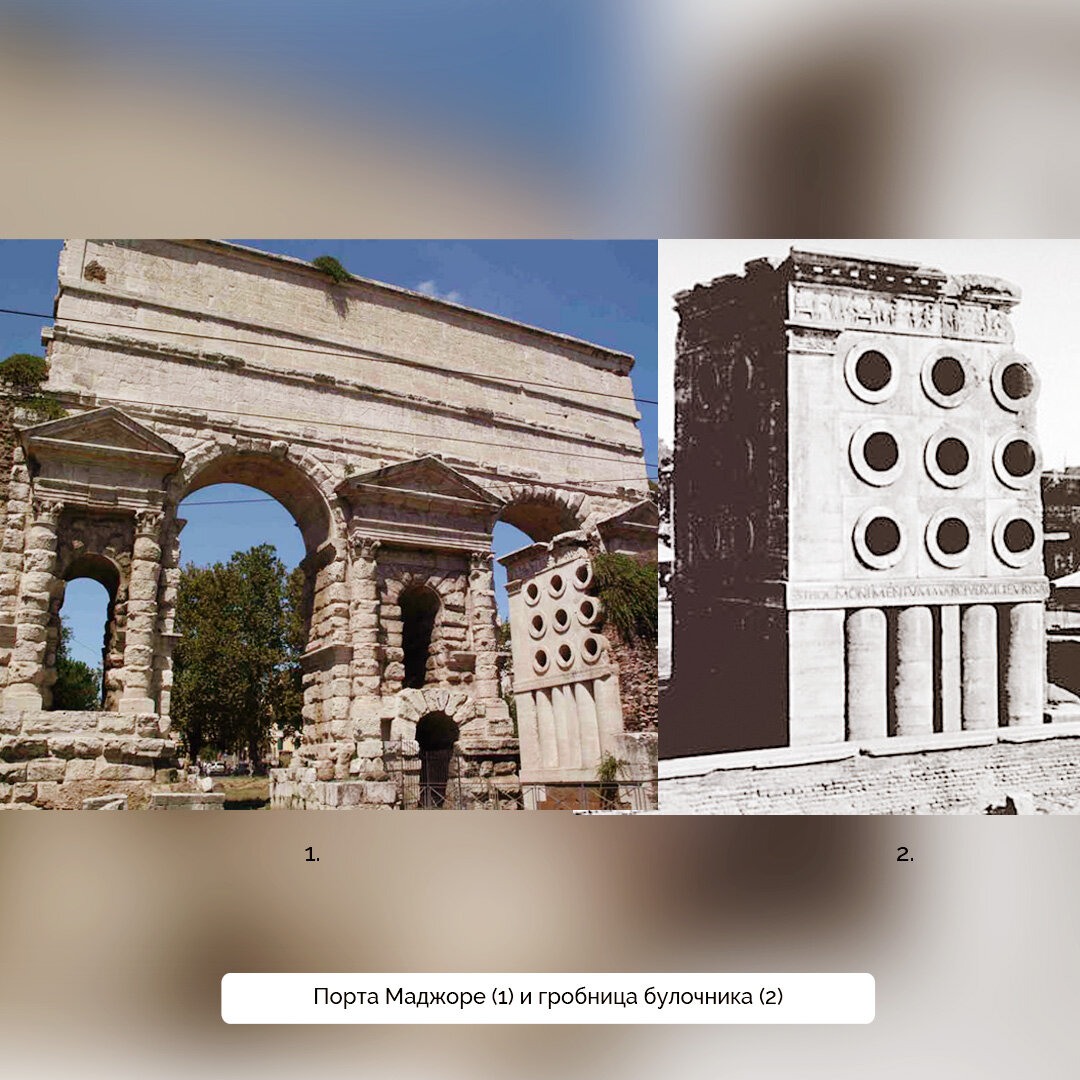 Древнеримские городские ворота, рядом с которыми стоит курьезная гробница булочника. Она имитирует вид то ли римский тестомешалки, то ли зернохранилища. Выглядит почти как модернистская архитектура.