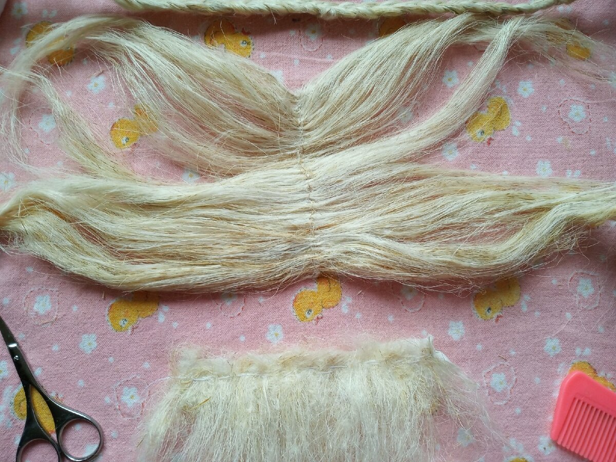 Продолжаю рассказывать о моей попытке восстановить пресс-опилочную куклу 50-60 гг, сделанную в СССР на фабрике 8 марта. Я уже "нарастила" ей ноги и пальцы, подготовила лен для парика, закрасила сколы, и разобрала тело для того, чтобы снять выкройки. Пришла очередь собирать игрушку обратно. Вот так я собирала парик. Он из сантехнического льна, отбеленного краской для волос. Владелец куклы решил, что прическа расчесываться не будет, и мы остановились на укладке "а-ля Тимошенко". "Парик" состоит из трех частей. Одна закрывает затылок от уха до уха, вторая формирует пробор от лба до шеи. Ну и коса, которую я подплела к основной массе "волос". Не знаю, как описать словами, надеюсь, на фото будет понятнее. Начинаю собирать конструкт на голове. Все - на клей ПВА, который, при необходимости, можно удалить. Все прядочки я закрепила на ткани, шила иголкой и волокнами льна. Кое-где между прядями проглядывала голова, я дам добавила еще прядей. Все расчесала мягкой щеткой, приплела косу, при