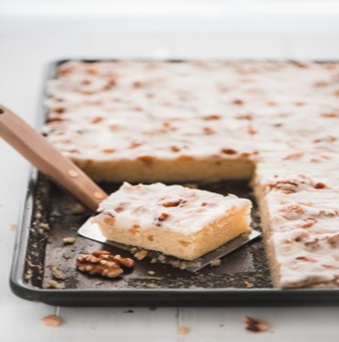 В нашем понимании это скорее пирог, сладкий пирог на противне, который можно порезать кусочками, но американцы называют его «листовой торт», что тоже хорошо. Как и многие блюда американской кухни готовится такой торт/пирог легко и просто, выпекается быстро и распространяет на весь дом чудесный ореховый запах. Замечательным образом подходит и для ежедневных чаепитий, и для буфетного стола (фуршетов) - нарезанный на небольшие кусочки торт так удобно раскладывать на блюдечки. Белый торт «Техас» с легкостью справится и с более важной задачей – украсить собой праздничный стол, например, новогодний, за счет своего «снежного» внешнего вида и ореховой посыпки, а что еще так связано с новогодними праздниками как снег и орехи! Ингредиенты: Для теста: 400 гр. муки