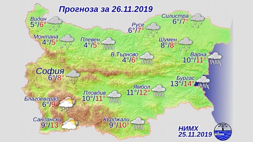 В следующие сутки будет облачно с дождем, а выше 1200 метров со снегом. К обеду дожди прекратятся и облачность начнет уменьшаться. Минимальная температура будет между 7° и 12°, а максимальная – между 8° и 13°... Прогноз погоды в Болгарии на 26 ноября