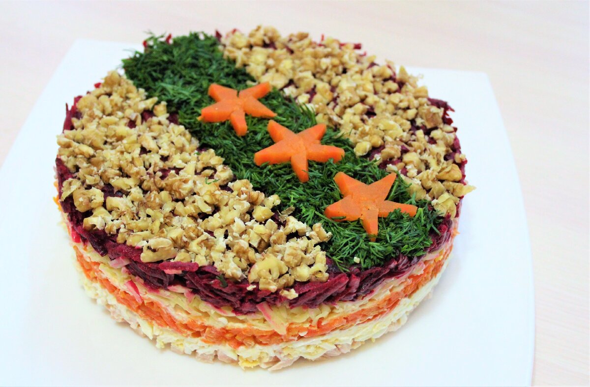 Украшение для подачи. Из мелко рубленой зелени укропа сделала дорожку имитируя погон на который поместила три звезды вырезанные из отварной моркови. Остальное свободное место украсила мелко рубленым грецким орехом. На мой взгляд получилось достойно. Салату нужно дать постоять в холодильнике минимум час, а затем освободив от кольца можно подавать на стол.