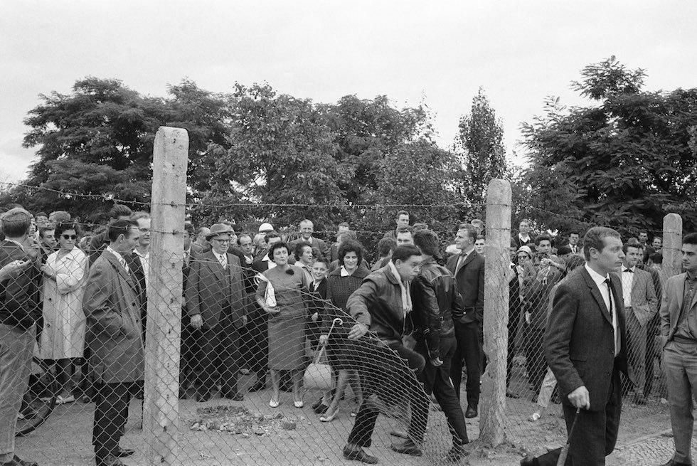 Самые решительные жители Восточного Берлина бегут на Запад через дырку в заборе, пока пограничники не видят. 15 августа 1961 года — всего спустя два дня после начала строительства Берлинской стены.