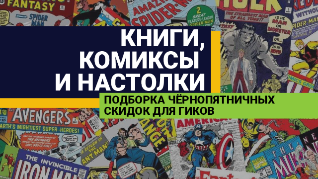 Что это там чернеет где-то далеко на горизонте? А это пятница. До неё осталось ещё несколько дней, но, к счастью, многие магазины уже начали свои традиционные распродажи. Мы покопались в их выгодных предложениях и сделали для гиков Kinda Media небольшую подборку с интересными скидками на книги, комиксы и настольные игры.