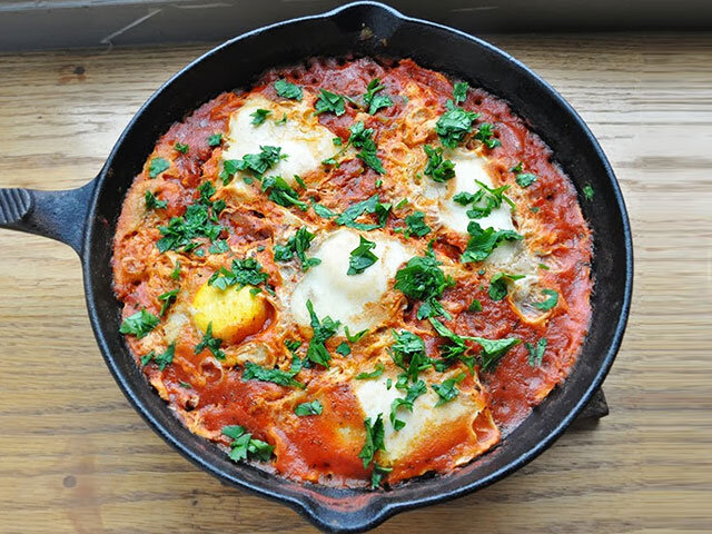 Состав продуктов: 5-6 куриных яиц, 200 г свежие или консервированные помидоры, 1 головка лука, 4-5 зубчиков чеснока, 1 стручок острого перца чили, 1 ст. ложка паприки, 1 ч ложка тмина, 1/2 часть пучка свежей петрушки, 1/2 ч. ложка соли, 50 мл оливкового масла. В каждом отдельном случае, по необходимости классический рецепт шакшуки можно подкорректировать под свои вкусы, например, вместо оливкового масла можно использовать подсолнечное или растительное, а стручковый перец заменить сушеными и класть по надобности. Такой завтрак из яиц в соусе из спелых помидоров легко адаптируется под любые потребности, при этом блюдо становится еще вкуснее. ШАКШУКА РЕЦЕПТ Нарежьте кубиками репчатый лук и нашинкованный тонко острый перец. Нагрейте масло и на небольшом огне слегка обжарьте нарезанные овощи, пока лук не пустит сок. Добавьте нарубленный чеснок, тмин и паприку. Размешайте все ингредиенты и, постоянно помешивая, продолжите готовить еще 2 минуты. Старайтесь не пережаривать! С помидоров сним