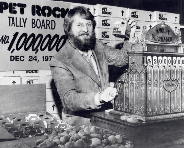 Гарри Росс Жаль разбогатевший на обычных побережных камнях. Дело было в 70х годах, однажды вечером сидя с друзьями в баре и слушая их жалобы на своих домашних питомцев Гарри предложил им завести в качестве питомца камень. Всё дружно посмеялись и забыли, но наш герой загорелся этой идеей и начал её реализовывать. Первым делом он сделал коробочку с дырочками, чтобы камушек не задохнулся. В самой коробочке помимо питомца лежит инструкция, в которой подробно на 32 страницах написано как нужно обращаться с камнем. Инструкция была написана с юмором, в ней написано на какие команды камень хорошо реагирует, а на какие плохо. Так же стоит отметить, что камни были породистые и вели свои корни от древнеегипетских пирамид. Продавая это чудо за 3.95 долларов за штуку Гарри смог