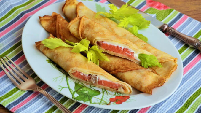 - Складываем готовые блины стопочкой и даем немного остыть. Теперь по одному блину выкладываем на разделочную доску, смазываем всю поверхность блина кремом, сверху кладем полоску семги слабосоленой и заворачиваем в рулетик.