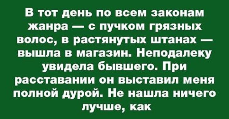 В то Рождество по всем законам жанра – с пучком грязных волос, в растянутых штанах и пуховике – спустилась в магазин на 1-м этаже. Вдалеке возле хлебного я увидела бывшего. При расставании он выставил меня полной дурой, потому в грязь лицом ударить было нельзя.