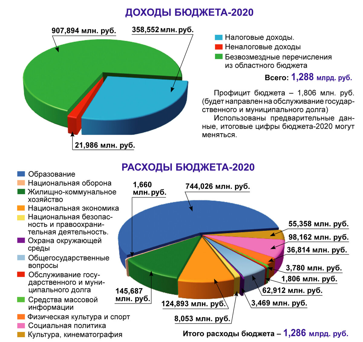 Общий объем расходов местного бюджета на 2020 год определен на уровне 1286,6 млн. рублей, он разделён условно на сферы - общегосударственные расходы (62,9 млн. рублей), национальную экономику, дорожное хозяйство и ЖКХ (270,6 млн. рублей), социально-культурную сферу (934,4 млн. рублей или 73% от общих расходов) и национальную безопасность (8,1 млн. рублей), прочие расходы (обслуживание муниципального долга, военкоматы, охрана окружающей среды) – 10,6 млн. рублей.