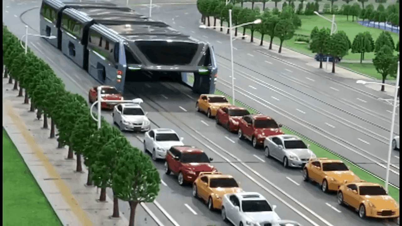 Проблема городского общественного транспорта в том, что на дороге один автобус или тролейбус занимает места столько, сколько бы занимало несколько машин. С ростом населения автотранспорта на дороге как общественного, так и личного становится только больше и далеко не во всех городах есть возможности для расширения дорожного полотна, что приводит к пробкам, которые могут задержать человека даже на несколько часов. Китайские разработчики попытались решить эту проблему, убрав с общей дороги общественный транспорт, а если быть точнее, то то они изобрели автобус, который движется над дорогами и общим потоком автомобилей, тем самым передвигаясь без пробок и не мешая автомобилям. Названный транзитным приподнятым автобусом, он выглядит как гигантский двухэтажный, но полый на первом этаже. Пассажиры могут сидеть на верхнем этаже, в то время как автомобили двигаются ниже. В августе 2016 года прошли первые испытания автобуса. Длина автобуса составляет 32 м, ширина-7,8 м, высота 4,6м.