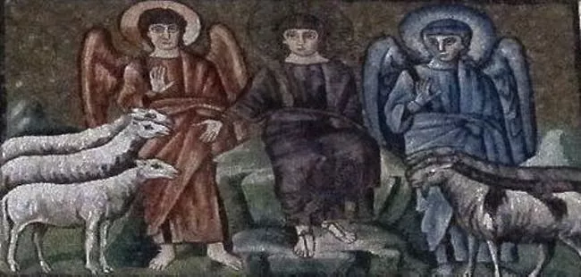 Иисус изображен на ней в королевских пурпурных одеждах в час Последнего Суда. Овцы, спасенные души, стоят рядом с красным ангелом, тогда как козлы, проклятые, стоят с синей фигурой, вероятно, сатаной. Здесь он – это падший ангел, а не демоническое существо с копытами. С красным цветом его начнут ассоциировать только столетия спустя.