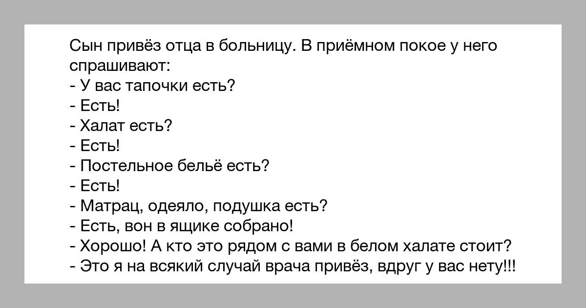 Порой самые смешные и нелепые анекдоты оказываются жестокой реальностью. -Доктор переведите меня в соседнюю палату. - А в чем дело? - Да, задолбало: на завтрак – каша, на обед – каша, на ужин, снова – каша. А за стеной, каждый полчаса утку подают! Звонок по телефону: — Это больница? — Морг. — Ой, мне еще рано. — Мы подождем! Больница сейчас — это место, где пациенты мешают врачам работать с документацией. Картинки взяты из открытых источников)