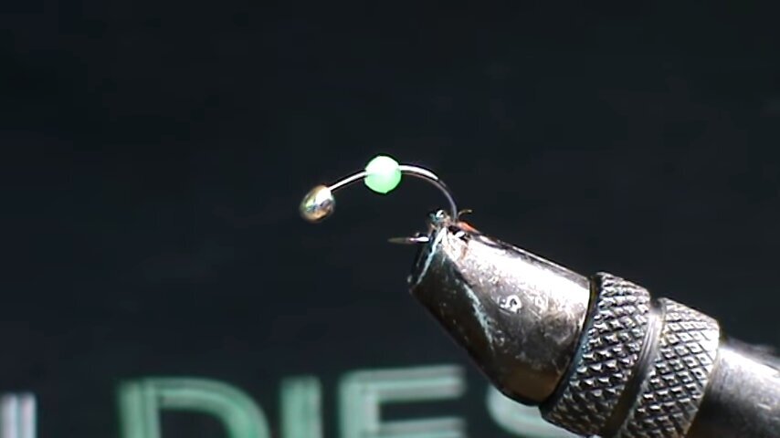 Одеваем светящийся в темноте шарик, диаметр 2.6 мм. Промазываем середину цевья супер клеем. Помещаем на клей шарик и ждём когда застынет.