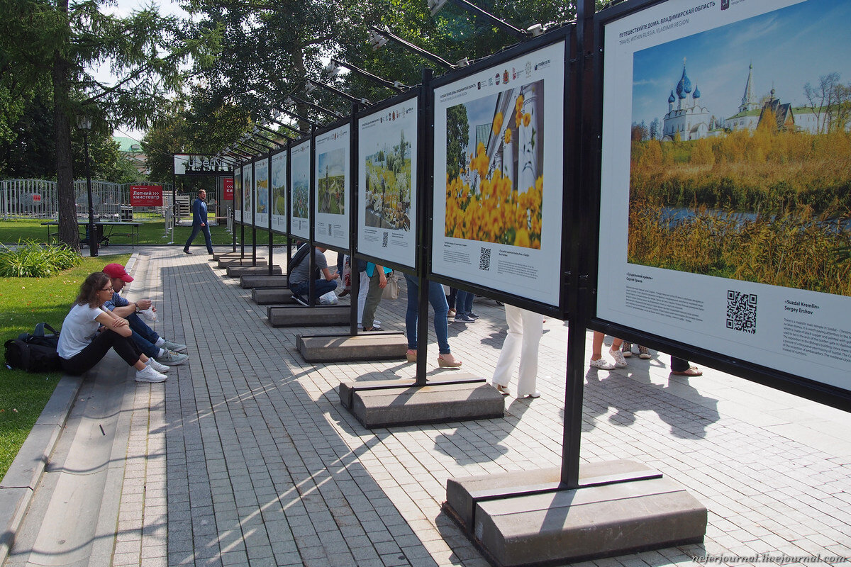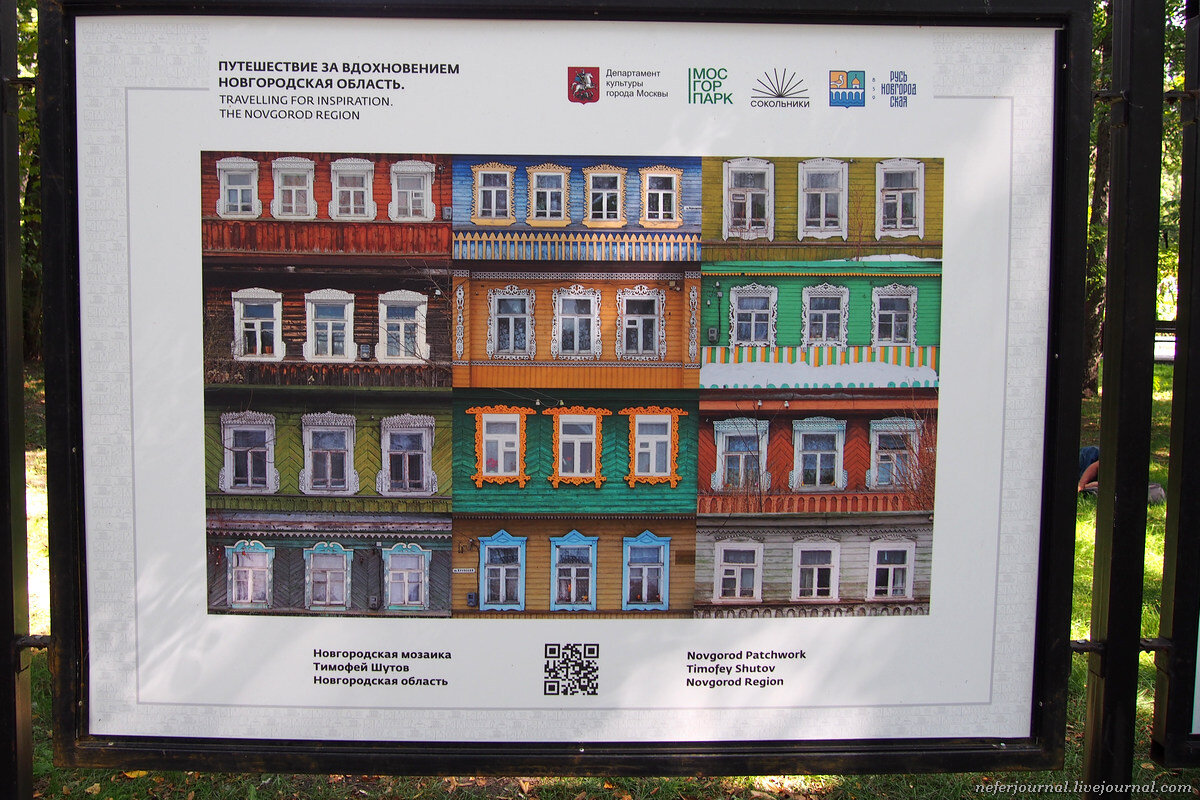 В Москве периодически проводятся фотовыставки. Стенды устанавливают на улицах города, на бульварах и в парках. Темы абсолютно разные. В данном случае - "Путешествие за вдохновением". Меня зацепили резные наличники, не смогла пройти мимо.
