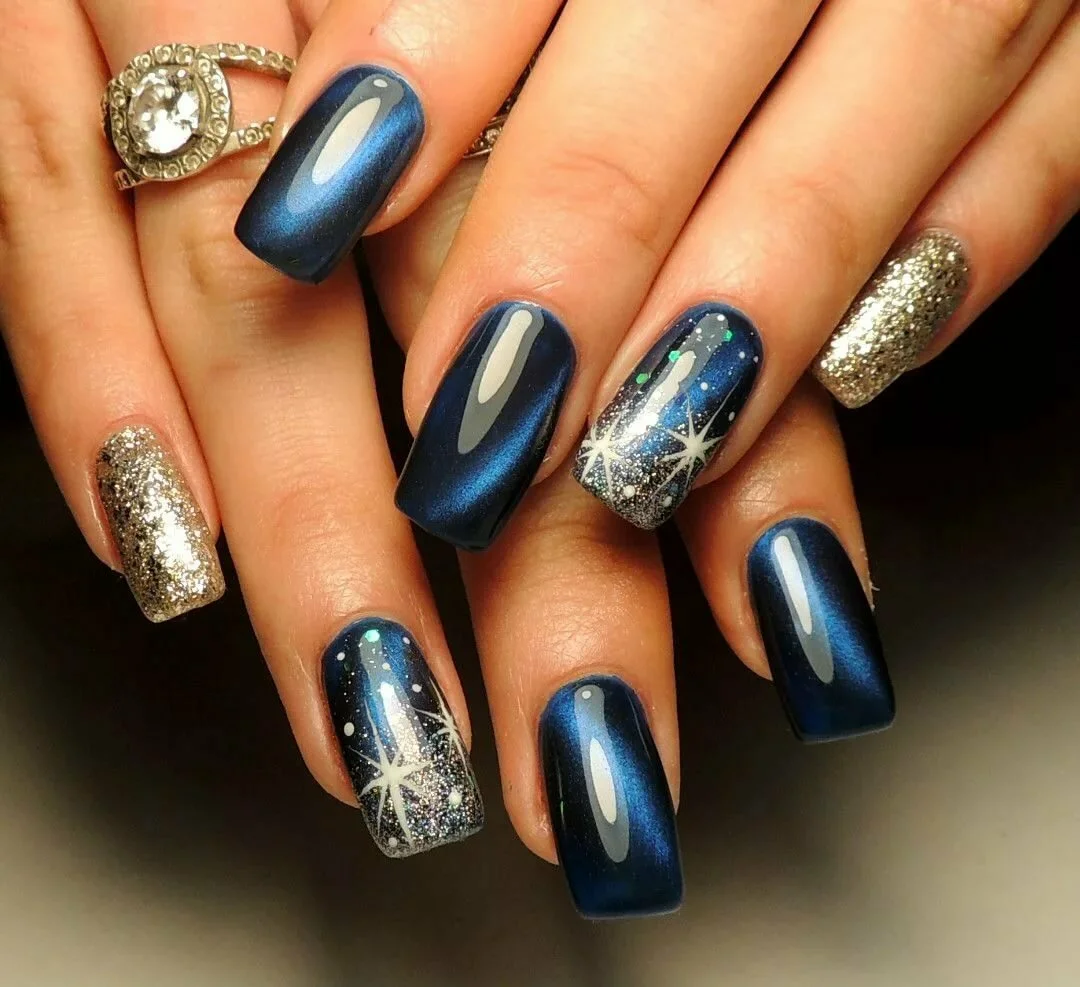 Вполне уместной окажется шикарная и блестящая россыпь стразов самых разных размеров. Обратите внимание на интересные зимние узоры, дополненные серебристыми блестками или глиттером.