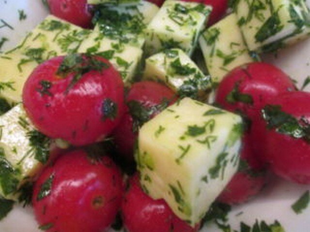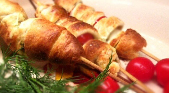 Рецепт в честь известного кинорежиссера Эмира Кустурицы придумал не менее известный кулинар Сталик Ханкишиев. Ему пришлось поломать голову, как из минимума ингредиентов, что имеются в запасе, накормить уже подъезжающего к нему гостя. И пришлось сотворить это чудо - в кратчайший срок запечь эти кебабы в тесте. Его рецепт прост и гениален, как и многие другие его рецепты. Кустурице кебабы так понравились, что подавались они на бис до тех пор, пока не закончился сулугуни. Какая это чудеснейшая закуска я уже убедилась и предлагаю убедиться вам. Какие нам понадобятся ингредиенты: Нарезаем сыр сулугуни кубиками, размером с помидор черри. Петрушку с укропом нарезаем мелко и перетираем вместе с солью.Кусочки сулугуни вместе с помидорами обваливаем в смеси зелени и чеснока. Замораживаем слоеное тесто при комнатной температуре, духовку разогреваем до 220*С. Затем размороженное тесто раскатываем до толщины 3 мм и нарезаем его длинными полосками. На шпажки нанизываем кусочки сыра и поми