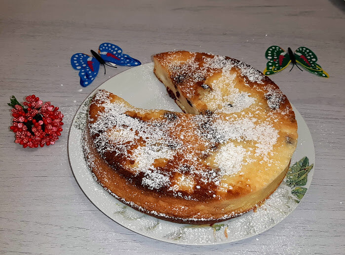к творогу добавляем 150 г сахара, можно 100 г щепотку соли 3 яйца 100 г сметаны любой жирности, у меня 15% вяленую клюкву, её можно заменить на изюм