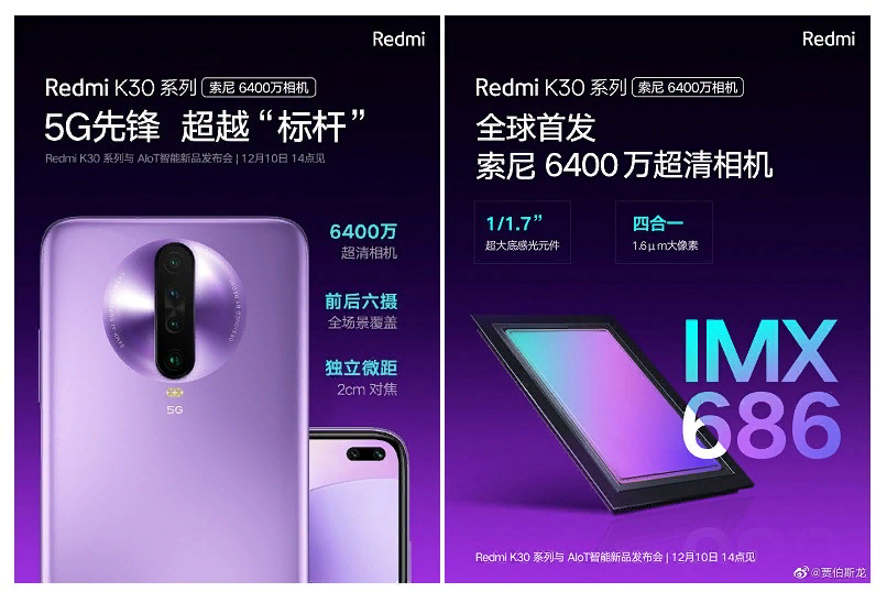 Относительно недавно компания Sony анонсировала старт массового производства сенсора IMX686. Однако до сегодняшнего дня было непонятно, на каком именно смартфоне дебютирует новейший датчик. Зарубежные СМИ выстраивали различные теории, но теперь большая часть из них опровергнута, поскольку появилась официальная информация. Компания Xiaomi опередила конкурентов. 64-мегапиксельный датчик камеры дебютирует на флагманском смартфоне Redmi. Сегодня утром вице-президент Xiaomi опубликовал на своей странице в Weibo очередной тизер. Промо-плакат полностью раскрыл спецификации камеры. Согласно анонсу, флагманский смартфон оснащен сдвоенным фронтальным модулем, а также основной камерой, состоящей из четырех объективов. Производитель заметно улучшил качество макросъемки. Дистанция фокусировки составляет всего лишь 2 см. Redmi K30 – это первый смартфон, оборудованный центральным процессором Snapdragon 765G. Флагман будет продаваться в двух модификациях – LTE-версия и модель с поддержкой 5G. Разу