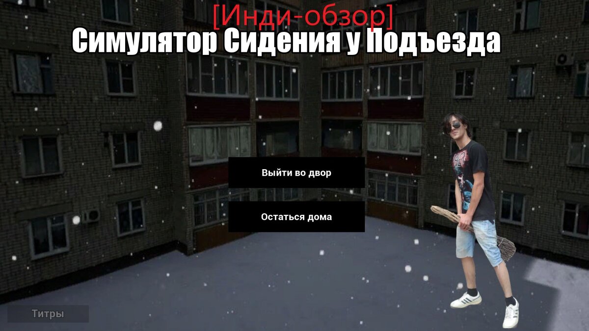 Я вас категорически приветствую. С вами - Тедан Даспар. И сегодня я подготовил для вас обзор на игру "Симулятор сидения у подъезда". Пойдём по плану. Жанр. Ну, название игры, как бы, и является её жанром. Это - несомненно симулятор. При этом - именно симулятор сидения у подъезда. Сюжет. Мне почему-то кажется, что сюжетом тут и не пахнет. Наш аватар (вместе со своим товарищем) просто сидит на корточках у подъезда и дышит свежим никотином. Стартовый монолог на тему: "Пацаны - ваще ребята..." - не несёт в себе никакой сюжетной информации. Геймплей. Ну, что сказать про геймплей? Его тут побольше, чем сюжета. Можно вертеть головой, можно обложить матом всё, что попадается в поле зрения, можно включить музыку. А ещё (из-за того, что точка фиксации камеры находится где-то на верхней губе персонажа) можно заглянуть в нос своему аватару. Плюсы и минусы. Начнём с плюсов 1) Весьма необычный игровой опыт. Возможность почувствовать себя полноценным бандитом нам уже давали многие игры. Но вот поч