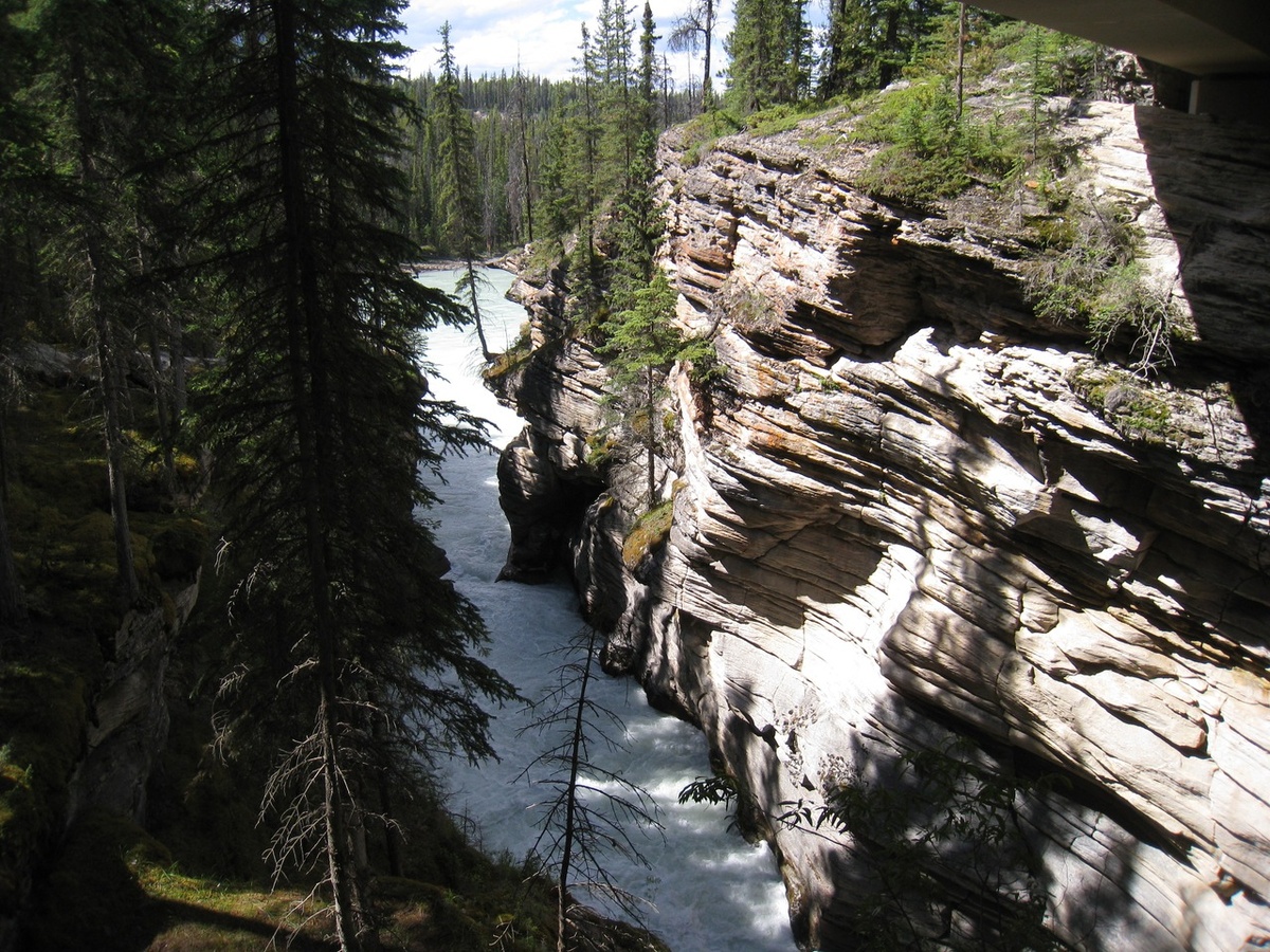 Доброго времени суток уважаемые друзья! Сегодня мы отправимся с вами на реку под названием Атабаска, которая находится в Канаде и берет свое начало из ледника Колумбия. Места там удивительные и очень красивые. Сейчас вы убедитесь сами... Вот из таких слоистых пород складываются Скалистые горы. Иногда хочется сказать "Слоистые горы." Пробежав стремглав по узкому слоистому каньону, река продолжает свой дальнейший спокойный путь. Надолго ли? Наверное до следующего водопада и каньона. Их здесь великое множество. Спокойное течение Атабаски. Трудно себе представить, что только что это был бушующий грохочущий поток. Ну а мы продолжаем наш путь дальше. Пейзажи меняются мгновенно. Только что можно наблюдать за спокойной рекой, и буквально через 30 метров она срывается вниз в глубочайший узкий каньон. Каньон Малингма или каньон дьявола. Та же самая река, что и на предыдущем фото, но уже протекающая в узком глубоком каньоне. Слоистые берега каньона. Продолжение сле