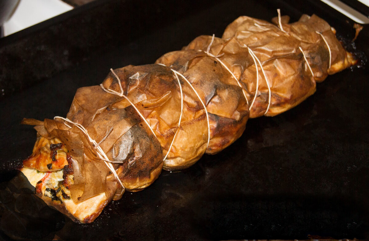 Помню, когда была маленькой, и когда мы приезжали с бабушкой на каникулы в Москву, останавливаясь в их родовом, еще довоенном доме (ветхом, многоквартирном, наполовину коммунальном, но неповторимо прекрасном), я больше всего удивлялась ароматам «булошных» на Павелецкой, совсем иным запахам на небольшой кухоньке, цвету рубиново-красного, точно не украинского, борща, а так же тем «парадным» блюдам, которые подавали к новогоднему или иному праздничному столу. Даже с учётом партноменклатурного положения бабули, красную рыбу мы ели дома только в нарезке, расстегаи и кулебяки у нас дома почти никогда не пекли, а в блины мы заворачивали или обжаренное мяско с луком, или творог сладкий, но никак не красную икру, как московская бабушка Мила (родная сестра моей бабушки). Обязательным блюдом на столе была «бандероль». Готовили её традиционно из красной рыбы с креветками или раками, запекали в большой старой духовке в коричневой, увлажнённой и промасленной почтовой бумаге, обернув сверху еще
