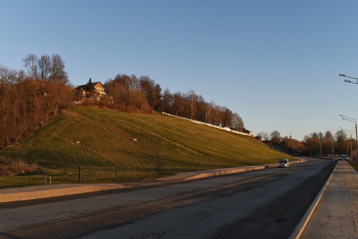 Вот чтобы вы сказали, глядя на эту фотографию? Что это за холм такой, как вы думаете? В древних городах, всегда подспудно ищу рвы, насыпи, оборонительные редуты и кремли с неприступными стенами. Калуга, конечно, не такой древний город, как Новгород или Киев, Суздаль или Владимир. Но всё же. Как думаете, похоже это она остатки калужского кремля? Был ли он вообще – не знаю. Допустим был, тогда по вашему как бы он выглядел? Наверное он был бы каменный. Строили бы его из местного известняка. Думаю, ледник притащил сюда его большое количество. Также как и песка. Калужский бор – великий и могучий с его многовековыми соснами стоит на большом скоплении песка. Да и дома у Оки, их цоколи либо из местного известняка, либо из супер-пупер кирпича, испечённого из местной глины. Так вот, если представить тот самый не существующий калужский кремль, то он каменный. Одной стороной смотрит на Оку, а другой – на березуевский овраг, глубокий и крутой. Отличный природный оборонительный редут. Остаётся не пр