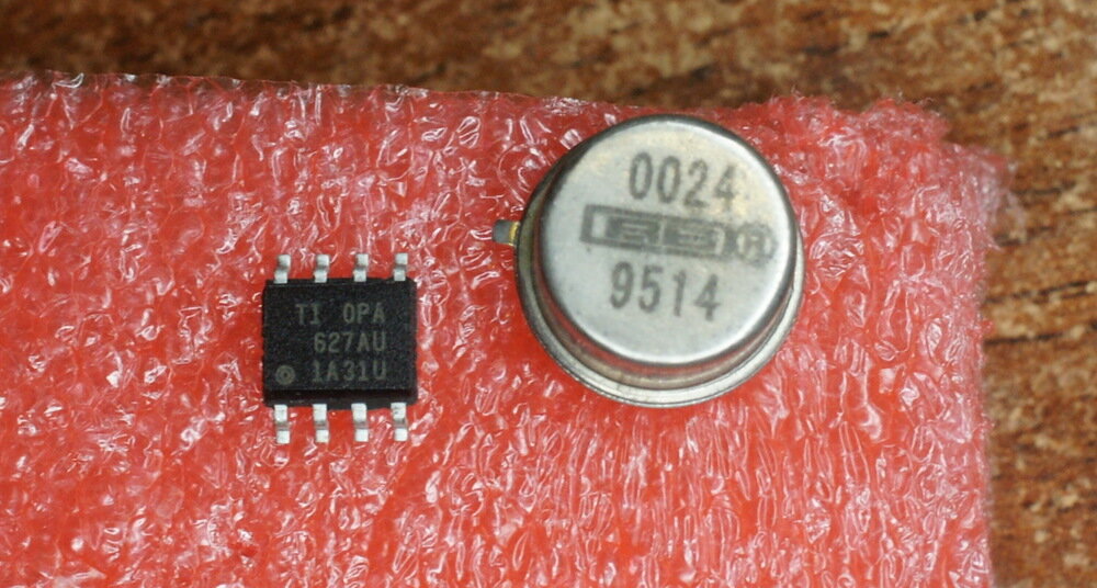 Покупая всякую всячину на ebay, я совершенно случайно наткнулся на OPA627. Это довольно старый, популярный и качественный операционный усилитель, который иногда используют в усилителях аудиофилы (и не только). Однако меня смутила цена — у производителя (Texas Instruments / Burr Brown) они по 16-80$ (в зависимости от исполнения), а на ebay их продавали по 2.7$, включая доставку. Сразу ясно, что там что-то не то, но интересно было узнать, что именно. Заказал 1шт, а для сравнения — OPA627 в металлическом корпусе за 5$, явно откуда-то выпаянную. Результаты сравнения внутренностей — под катом. Полученные микросхемы Пластиковый корпус пришлось травить, а металл — можно просто спилить: Сравниваем Сначала оригинал. Видно по меньшей мере 4 подрезаемых лазером резистора — становится понятно, откуда такая стоимость. Подстраиваемые лазером резисторы нужны т.к. при производстве микросхемы параметры компонент немного «плавают», а в операционных усилителях их нужно согласовывать очень точно. «К