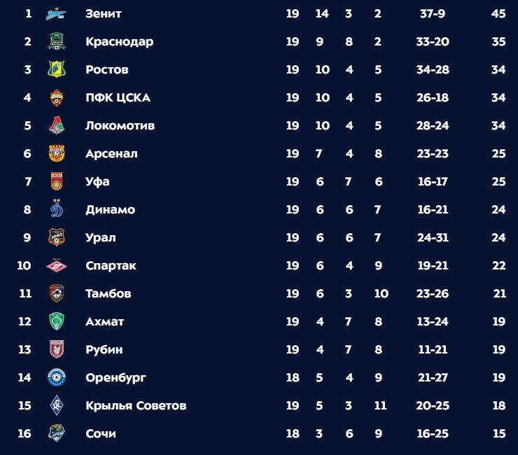 Подведем промежуточные итоги российской футбольной премьер-лиги сезона 2019/20. Сыграно 19 туров. Таблица на конец года выглядит вот так. Зенит. Уже мало кто сомневается, что клуб станет чемпионом. Что может помешать? Сбой, в случае, если придется играть на 2 фронта (чемпионат+еврокубок) и у ведущих игроков в какой-то момент будет мало сил и эмоций. Травмы лидеров. Впрочем, скамейка запасных у Зенита настолько внушительная для внутреннего чемпионата, что вряд ли. И уж точно, только сам Зенит сможет упустить победу. Никто из конкурентов не обещает на одном мощном уровне, без спадов, провести оставшийся отрезок чемпионата. Краснодар, Ростов. В тройке лидеров нет московских клубов. Зато два "южнорусских". Будущее Краснодара видится более надежным. Пожалуй, команда будет в призёрах. На медали Ростова ставки бы делал с осторожностью. Локомотив. Провал в конце года связан с провалом в Лиге Чемпионов. Но зима будет неспокойной для Юрия Палыча. Уж больно много тех, кто хочет сместить его с по
