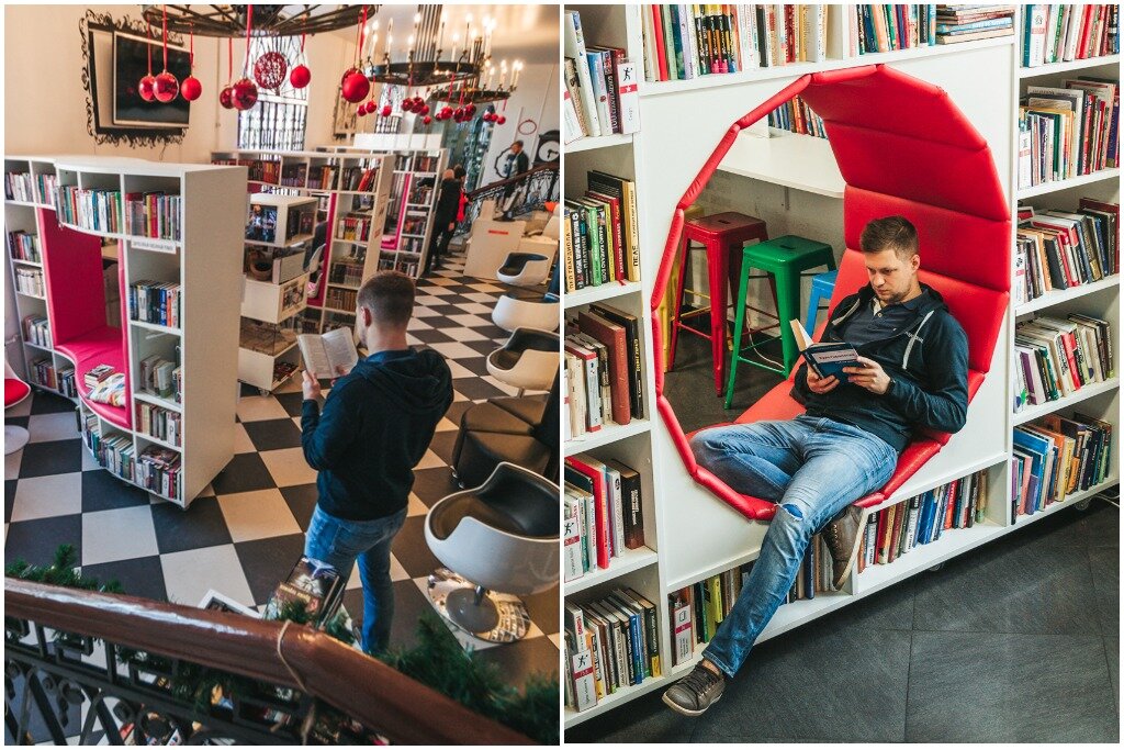 Итак, чего же такого необычного может предложить модернизированная библиотека? Как минимум обновлённые позиции для чтения. Не могу сказать, что они вдохновлялись камасутрой, и теперь вам нужно читать в позе лотоса вверх ногами, а страницы переворачивать пяткой, но согласитесь, что с книжкой гораздо приятнее развалиться на диване, сесть на подоконник или лечь облокотившись на что-то, чем тупо сидеть за столом аки за школьной партой. Поэтому гостям библиотеки не только разрешили использовать для чтения все существующие поверхности, но и создали для этого возможности. В интерьер добавили ковёр-травку и необычные стеллажи с мягкими «дырками», которые здесь почему-то называют кресла-капсулы.