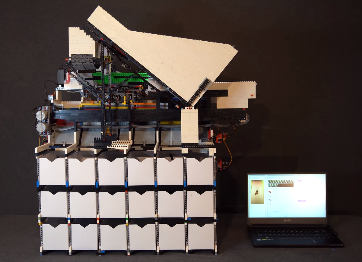 Есть люди, которые находят сортировку деталей LEGO терапевтической процедурой, но большинство не любят эту задачу. Правда, это касается взрослых. Дети чаще всего не заморачиваются по этому поводу и строят свои творения, выбирая кубики из кучи деталей. Энтузиасты предпринимали несколько попыток создания систем сортировки на основе деталей LEGO, но имеющиеся ограничения электроники не позволяли воплотить идею в полном объеме. А вот Дэниелу Весту, использовавшему искусственный интеллект, удалось построить универсальную сортировочную машину, распределяющую каждые 2 секунды по одному кубику. В основу системы заложена концепция свёрточной нейронной сети. Она использует существующие базы данных для анализа и распознавания почти всех когда-либо созданных деталей. Всего это более 25 миллионов 3D изображений взятых из библиотек деталей LDraw и Rebrickable и др. Установка разделена на три модуля – отделение деталей, сканирование и распределение по кюветам. По оценкам создателя, в конструкции