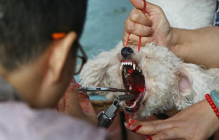 В Китае избавляются от конфликтов с соседями варварским способом. Недавно стала известна история о том, как в одном из городов на юго-западе Китая был арестован ветеринар, оказывающий услуги владельцам собак, не имея на то лицензии. Такого рода деятельность, безусловно, незаконна, но то, что сделало эту историей такой резонансной — это те процедуры, которые он оказывал животным. К сожалению, этот арест — далеко не единственный в стране, на самом деле подобные неофициальные услуги оказываются если не по всему Китаю, то на достаточно большой его части. Ветеринары без лицензии, в нестерильных условиях удаляют домашним собакам голосовые связки. И делают они это не насильно — хозяева животных сами приносят своих питомцев на эту процедуру, потому что, по их словам, устают от лая. Фотографии, которые были сделаны во время работы одного такого ветеринара, по-настоящему ужасают. Мужчина работает без перчаток и без каких-либо условий для стерилизации своих инструментов, прямо на улице. Ему пом