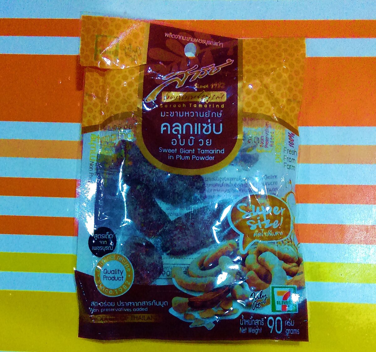 В продолжение темы о самых нелепых тайских вкусностях у меня есть еще небольшая подборка для Вас, мои хорошие. Это весьма странные для русского человека продукты, и при взгляде на некоторые из них сложно определить, что это вообще такое. Не говоря уже о том, как догадаться о том, какое на вкус содержимое упаковки. Вот например Тамаринд. Не просто тамаринд, а Sweet Giant Tamarind in Plum Powder - Сладкий гигантский тамаринд в сливовой пудре. Тамаринд - это чрезвычайно полезный фрукт. Он очень забавно выглядит. Мне кажется, что он похож на гигантские плоды неочищенного арахиса. Только внутри не орешки, а темная кисло-сладкая вкусная мякоть, внутри которой прячутся крупные и красивые косточки, похожие на камешки квадратной и прямоугольной формы. Даже если вы раньше ели тамаринд и даже знаете, что это такое, то ни за что не угадаете вкус того, что в этой пачке. Вы наверняка подумаете, что это просто сладкий тамаринд. Но не тут то было. Вы просто плохо знаете тайцев )). Тайцы будут не тайцы