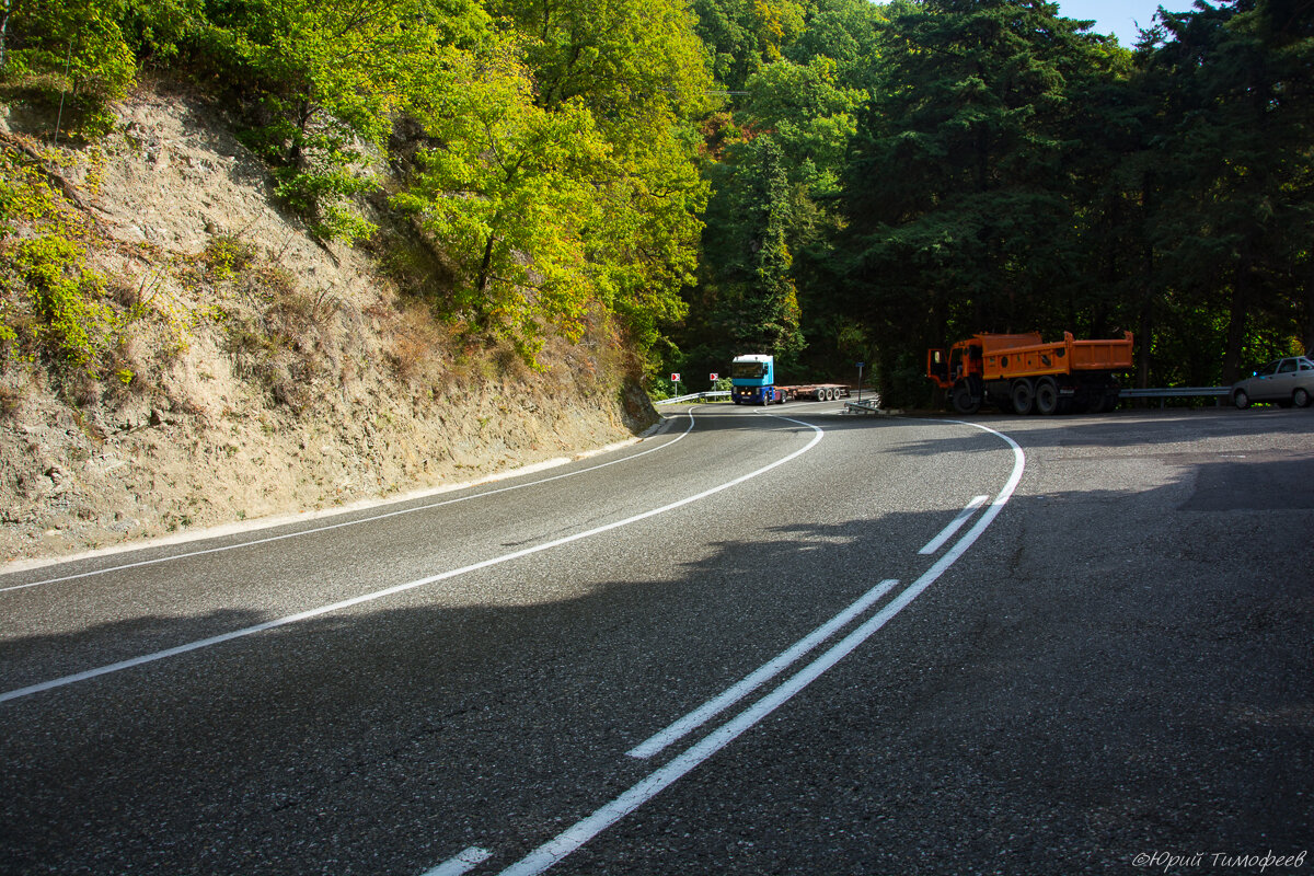 За один день проехать от Ялты до Абхазии не удавалось, да мы к этому и не стремились. Гораздо интереснее ехать неспешно, посещая те или иные достопримечательности черноморского побережья. Думаю, что в дальнейшем покажу и расскажу обо всех этих примечательностях - про завод шампанских вин в Абрау-Дюрсо, про длиннющую, в несколько километров, набережную Геленджика, про дольмены и водопады по дороге на Михайловский перевал и многое другое, что нам встречалось. Проблем с отдыхом и ночёвкой на всём протяжении пути - от Геленджика и далее - в конце сентября нет. Ночевали в одной из придорожных гостиниц. Дорога от Михайловского перевала до Сочи - сплошной серпантин. Но горные серпантины для нас привычны и комфортны.