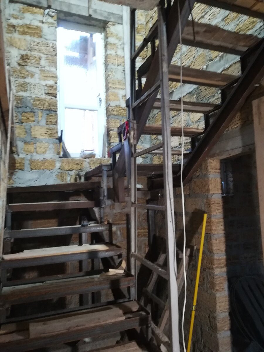 Фундамент, коробка и крыша это еще не весь дом. Внутренняя отделка занимает не меньше, если не больше сил и средств. Как я уже писал в предыдущих статьях дом из ракушняка при всей его дешевизне потребует дополнительных расходов на оштукатуривание стен. Порой слой штукатурки может достигать 3-4 см, а в некоторых местах и больше. Но у меня пол дела уже сделано, дом под крышей и с окнами, поэтому можно неторопясь заниматься отделкой. Перед штукатуркой стен, первым делом, я озадачился лестницей на 2 этаж, чтобы не тягать раствор по стремянке. Не стал рисковать и заказал проект лестницы проектировщику за 5000 руб. Взамен получил полный расклад по всем элементам с точными размерами. Осталось купить металл и сварить. Дело оказалось не таким простым и пришлось возиться целый месяц вечерами после работы. Такую конструкцию варил впервые в жизни, но все получилось нормально, потом залью ее бетоном, обложу плиточкой и будет красота.